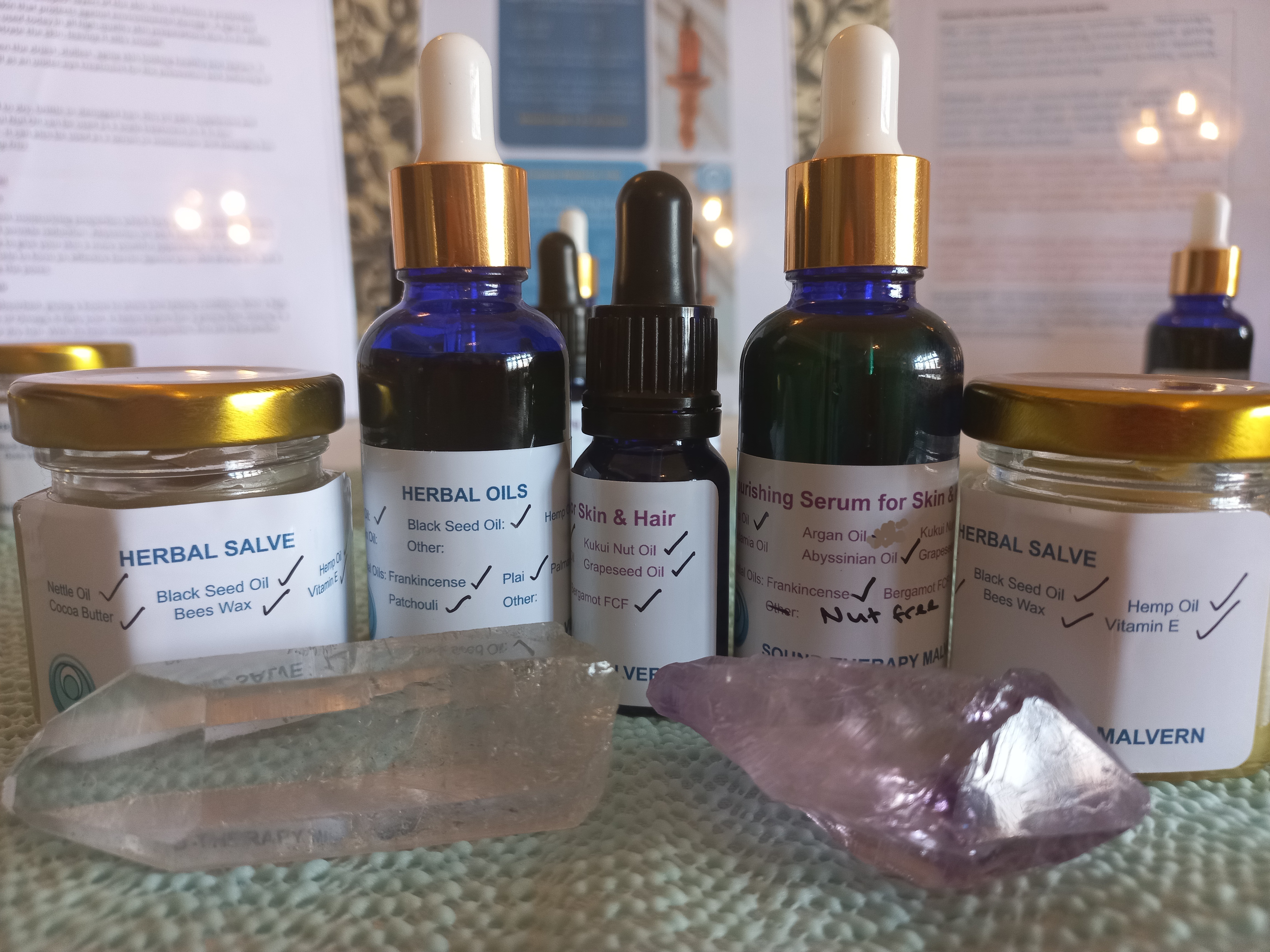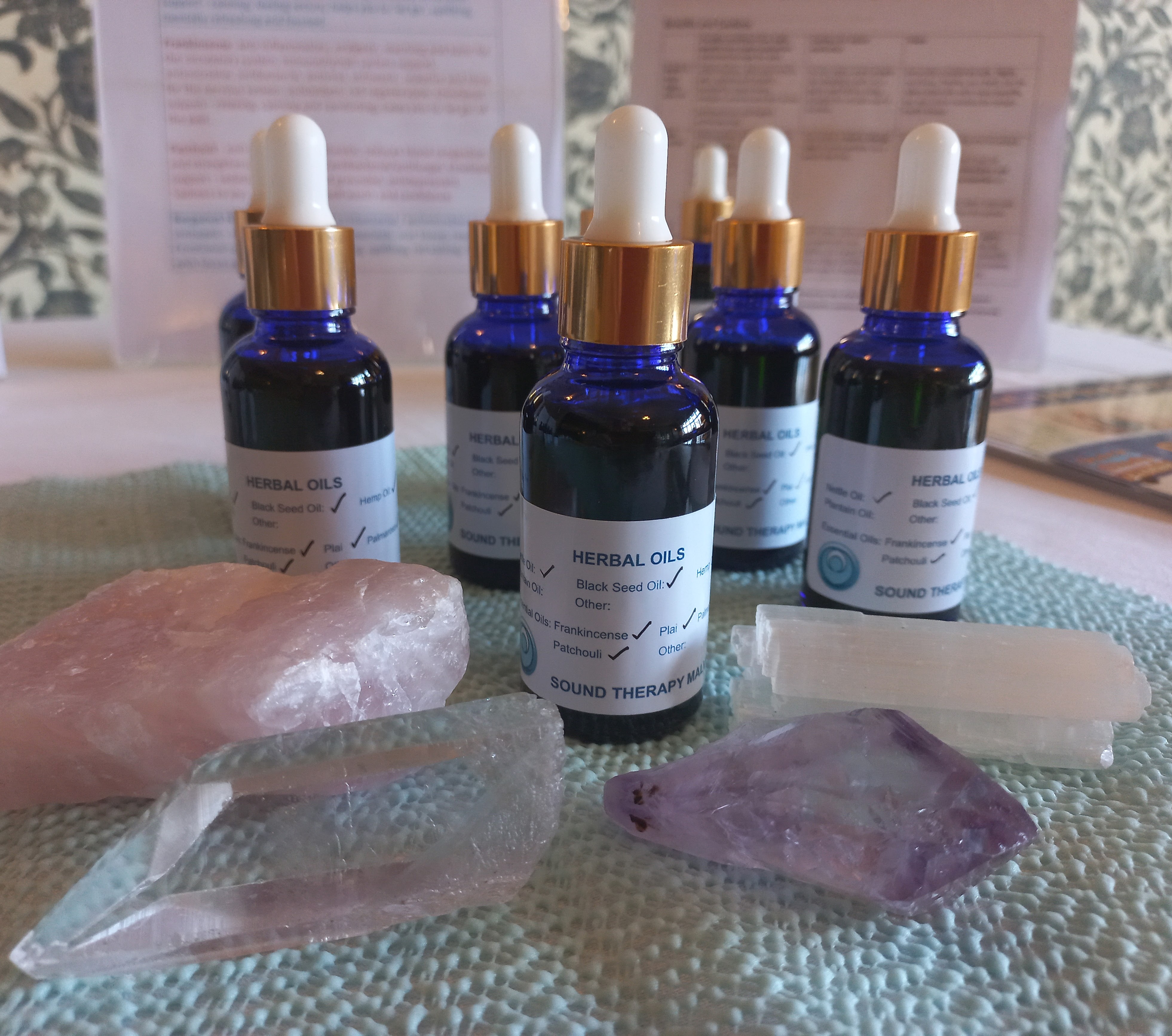 These can be customised, if needed, with a wide range of plant oils and essential oils available (including many organics) Email me with your requirements and we can discuss options: soundtherapymalvern@gmail.com