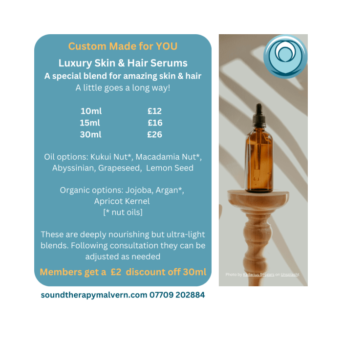 LUXURY NOURISHING SERUMS FOR SKIN & HAIR – 10ml £12, 15ml £16, 30ml £26. For amazing skin and hair, these ultra-light serums are deeply penetrating and made with premium oils (mostly organic). I use the same oils as those used in the most expensive products you can buy, but my serums don’t come with their price tags, and mine can be adjusted as needed have more certified organic oil options available.